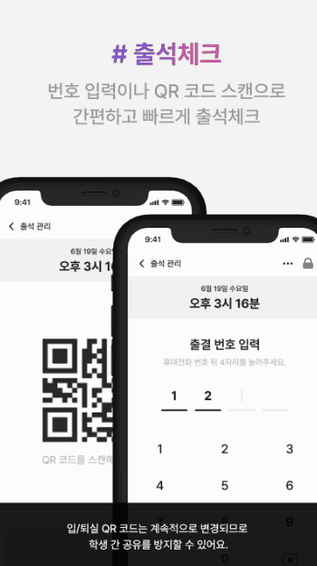 - 별도의 기기 없이 스마트폰이나 태블릿 PC에 앱을 설치하여 손쉽게 출결 키패드를 설정하고, 학생들이 직접 출결을 처리할 수 있습니다.