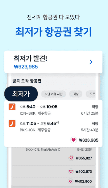 - 수천 개 항공사와 여행사를 한 번에 비교하여 최저가 항공권을 빠르게 찾아줍니다.