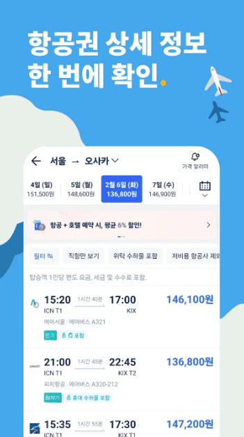 - 저가항공부터 대형 항공사까지 다양한 항공권을 한 번에 비교하고 실시간으로 예약할 수 있습니다.