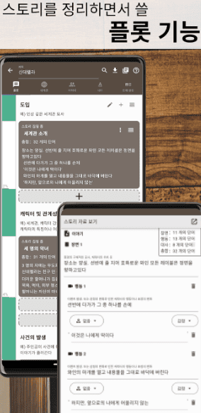 - 언제 어디서든 떠오르는 영감을 아이디어 노트에 기록하고 이 조각들을 실제 플롯에 손쉽게 배치할 수 있습니다. 흩어져 있던 반짝이는 아이디어들이 이야기의 중요한 요소로 활용되는 놀라운 경험을 할 수 있습니다.