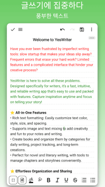혹시 글쓰기부터 노트 필기 할 일 관리까지 여러 앱을 번갈아 사용하며 불편함을 느끼고 계신가요. YesWriter는 바로 그런 당신을 위한 강력한 올인원 글쓰기 솔루션입니다. 이 앱은 소설 창작부터 간단한 메모 일상 기록까지 모든 텍스트 작업을 하나의 앱에서 완벽하게 처리할 수 있도록 설계되었습니다. 더 이상 흩어진 아이디어와 할 일을 찾아 헤맬 필요 없이 모든 창작 활동과 일정을 이곳에서 체계적인 관리가 가능합니다. YesWriter는 당신의 복잡한 디지털 라이프를 단순화하고 오직 중요한 일에만 집중할 수 있도록 도와 최고의 생산성을 경험하게 할 것입니다.