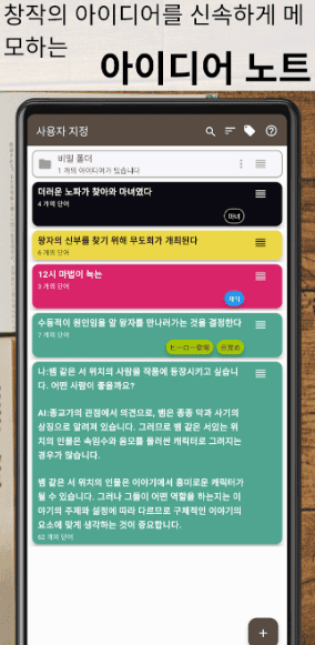 - 언제 어디서든 떠오르는 아이디어를 놓치지 않고 빠르게 메모할 수 있습니다. 게다가 단순한 기록을 넘어 특정 캐릭터나 설정에 아이디어를 직접 연결하여 나중에 쉽게 찾아보고 활용할 수 있습니다.