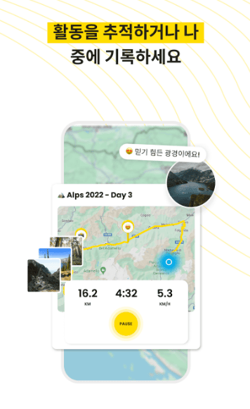 당신의 야외 활동을 3차원 비디오로 기록하고, 경로를 시각적으로 확인할 수 있습니다. 사진과 하이라이트를 추가하여 활동의 특별한 순간을 더욱 생동감 있게 표현할 수 있습니다.